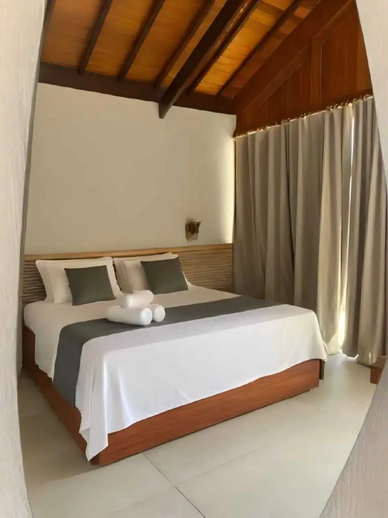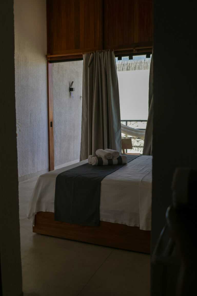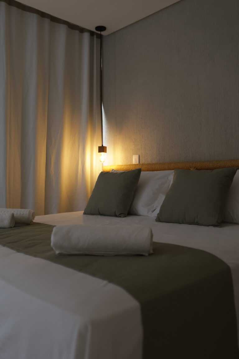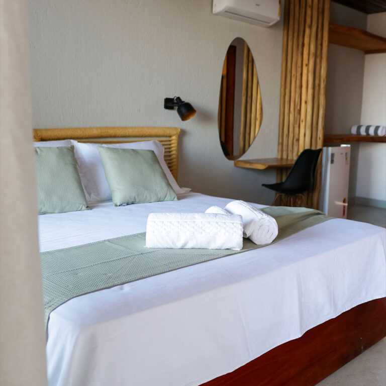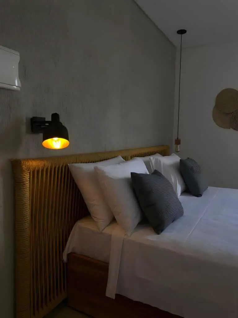 Todas as Suítes Com Piscina Privativa são decoradas com obras minimalistas de artistas locais e luz ambiente. Nesta acomodação, além da comodidade dos nossos serviços, o quarto dispõe de uma varanda privada, com mini sofá acolchoado na paleta de cores da pousada. Suíte espaçosa, dispõe de uma cama king-size que garante uma noite de sono agradável.