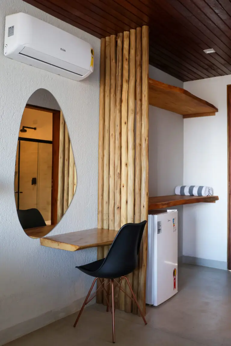 Todas as Suítes Com Piscina Privativa são decoradas com obras minimalistas de artistas locais e luz ambiente. Nesta acomodação, além da comodidade dos nossos serviços, o quarto dispõe de uma varanda privada, com mini sofá acolchoado na paleta de cores da pousada. Suíte espaçosa, dispõe de uma cama king-size que garante uma noite de sono agradável.